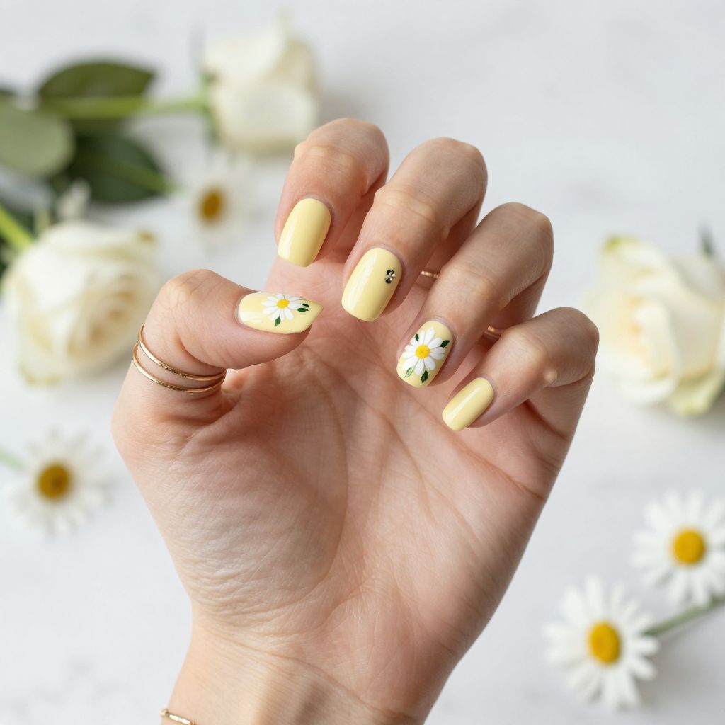 - Accent details: white squiggle on one nail