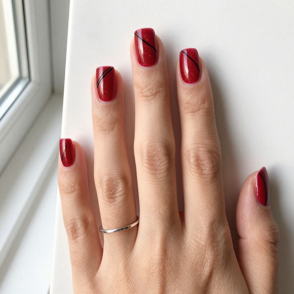 This manicure fits parties, date nights, and winter gatherings very well. It does require a tidy application because bold red shows chips more quickly than softer shades.