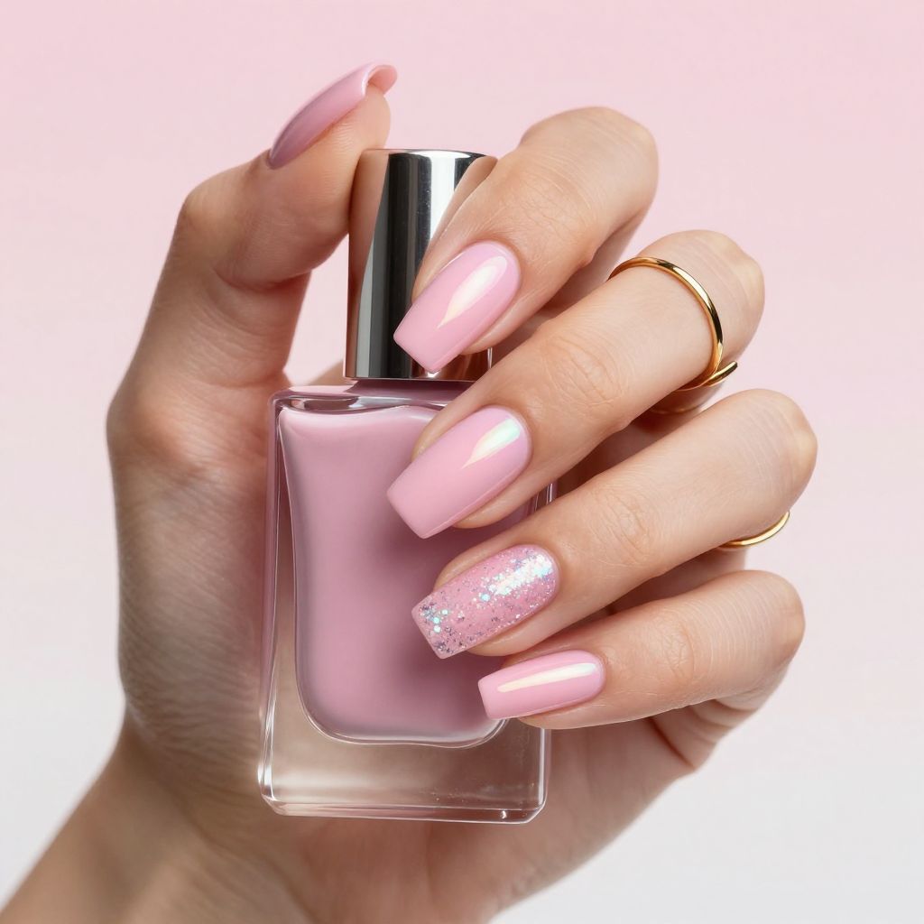 - Finish: glossy with holographic glitter near cuticle