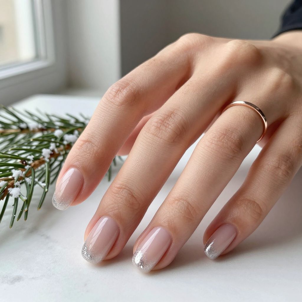 A short squoval nail gives this design a neat and balanced base. The manicure starts with a soft nude or pale pink color, then fades into silver glitter toward the tips for a look that mimics fresh snowfall.