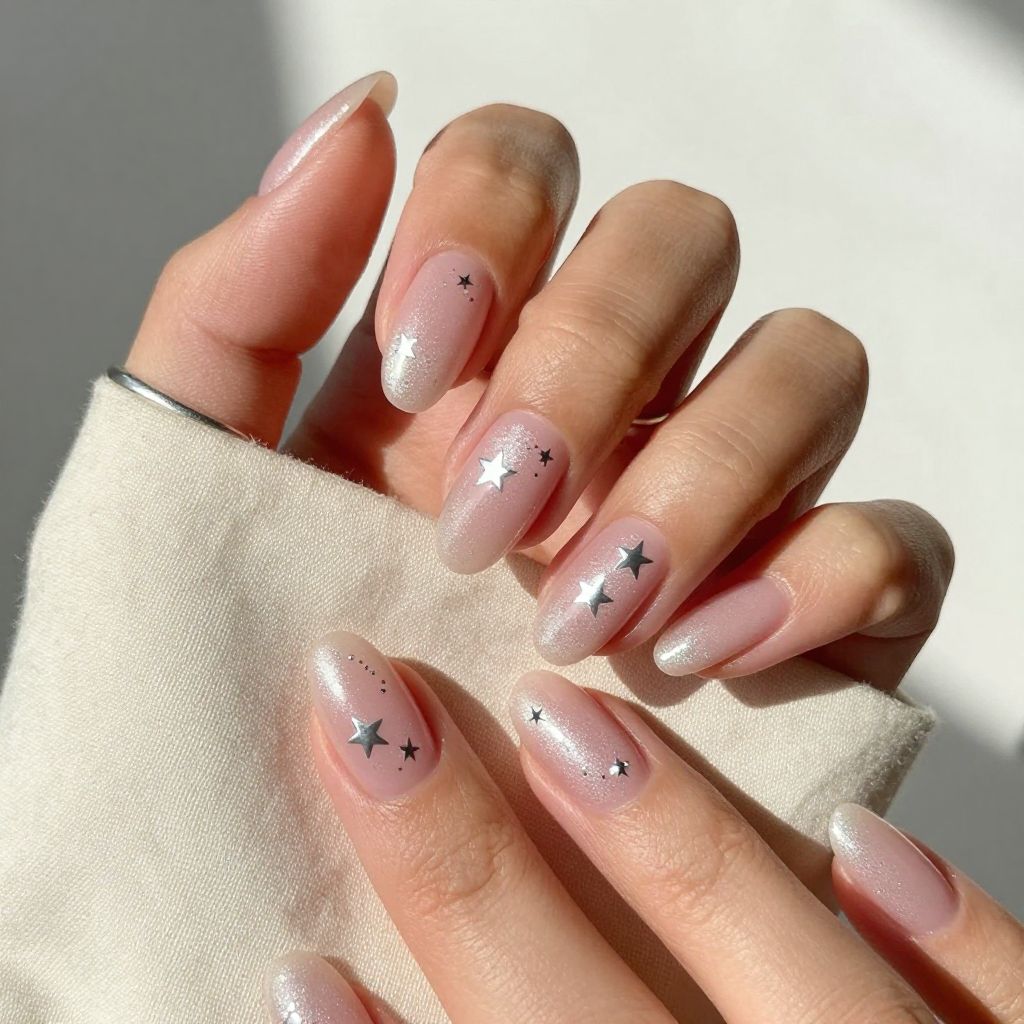 Medium almond nails provide a graceful base for tiny silver star accents. A neutral or pale pink background keeps the design light, while small silver stars add playful detail without overwhelming the nail. The look balances whimsy and polish, which makes it easy to wear.