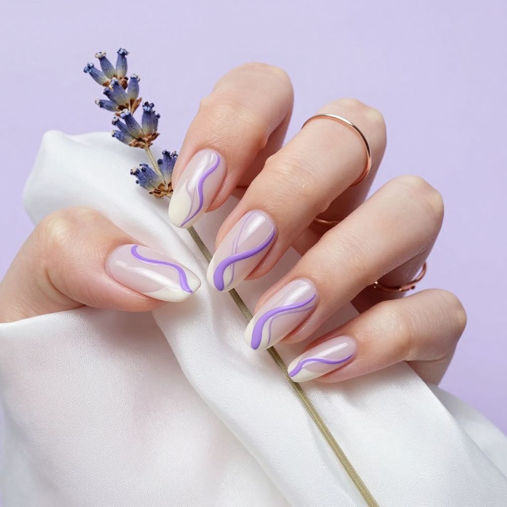 Soft lavender pairs with icy pearl shimmer for a chilled latte vibe.
