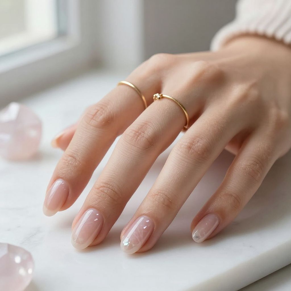 I paint a sheer white jelly coat that lets the natural nail peek through and the look feels like a soft cloud.